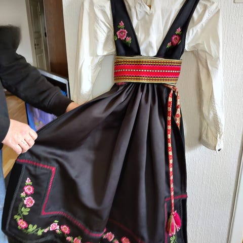 Raudsaum/rødsøm. Helt ny. Meget høy kvalitet i stoff og broderier. Med skjorte, jakke, veske, veskelås og forkle. Selges i utgangspunktet uten maljer. Nypris ca 90 000