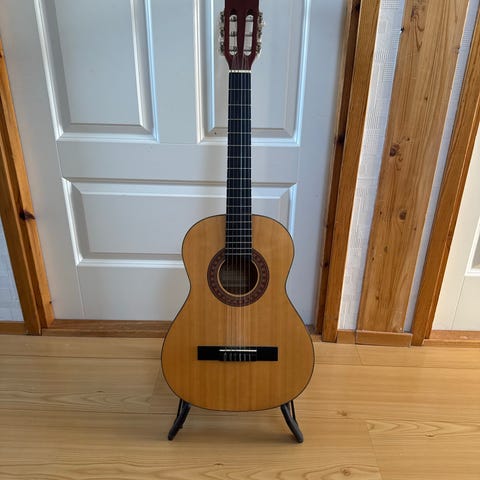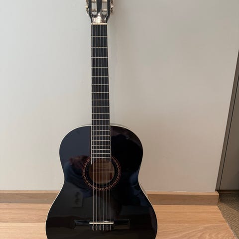 Klassisk akustisk gitar i svart farge. Gitaren har nylonstrenger og tradisjonelt klassisk gitarhode med åpne stemmeskruer og hvite stemmeskru-knapper. Kroppen har helsvart høyglans finish, både på front, bakside og sider. Egnet som standard klassisk gitar til generell spilling og øving.
