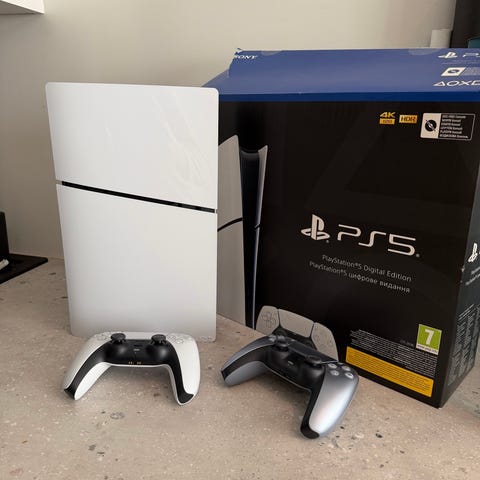 Sony PlayStation 5 spillkonsoll i hvit farge. Konsollen har innebygd diskdrev for fysiske spill og medier. Leveres med en trådløs DualSense-kontroller i matchende hvit og svart design.