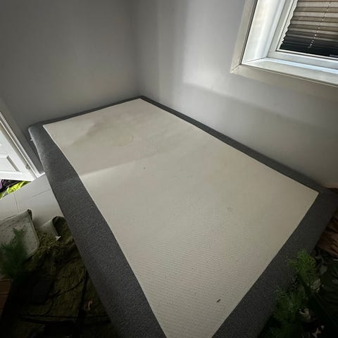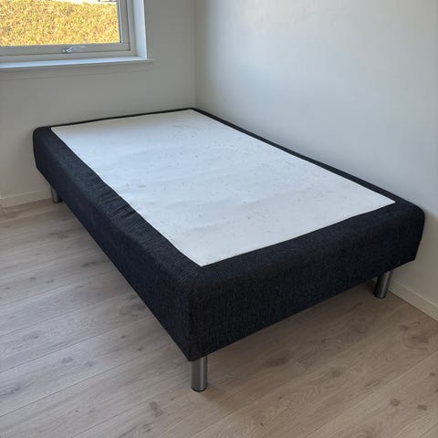 IKEA rammemadrass med svart tekstiltrekk. Rammen er i tre med polstring og fjær-/skumkjerne. Madrassen kan brukes som seng alene med ben, eller som base i en sengeløsning sammen med overmadrass. Passer til soverom, gjesterom eller andre steder der det er behov for en enkel sengeplass.