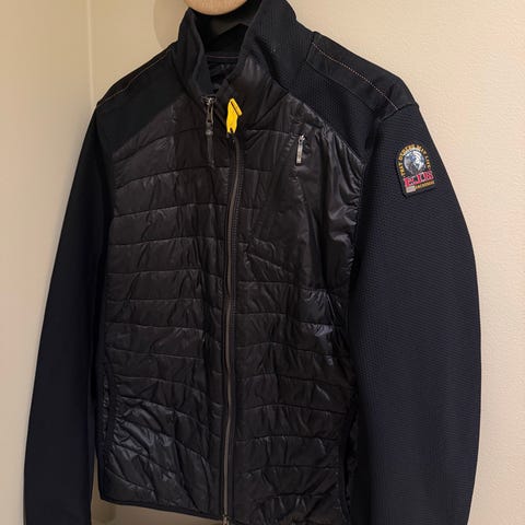 Parajumpers Warm Up jakke for herre i størrelse XS. Jakken er svart og laget i polyester. Front og øvre del av ryggen har vatterte paneler, mens ermer og sider er i glatt stoff. Modellen har høy krage, gjennomgående glidelås foran og glidelåslomme på brystet. På venstre overarm sitter Parajumpers-logo. Jeg er en S og passer meg godt