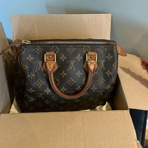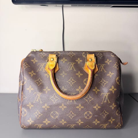 Louis Vuitton Speedy veske for dame i lær. Vesken har klassisk brun monogram-canvas med doble håndtak i skinn og glidelåslukking på toppen. Metall-detaljer i gullfarge og skinnforsterkninger i sidene. Innvendig hovedrom med plass til nødvendigheter til hverdagsbruk. Egnet som håndveske eller mindre hverdagsveske for dame.