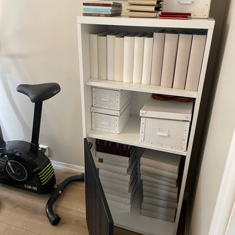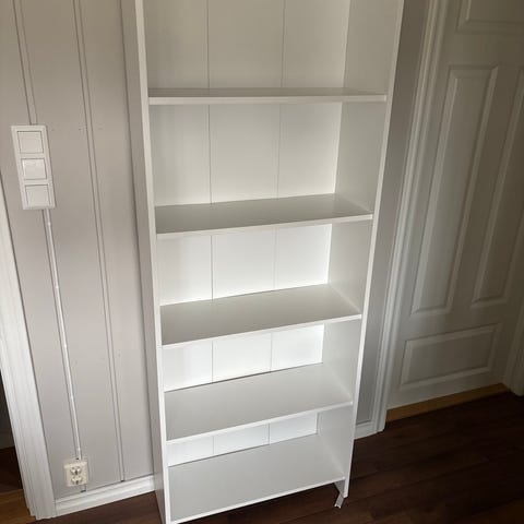 Hvit hylle fra Jysk gis bort. Noen bruksmerker og en skrue i toppen etter å vært festet til veggen.