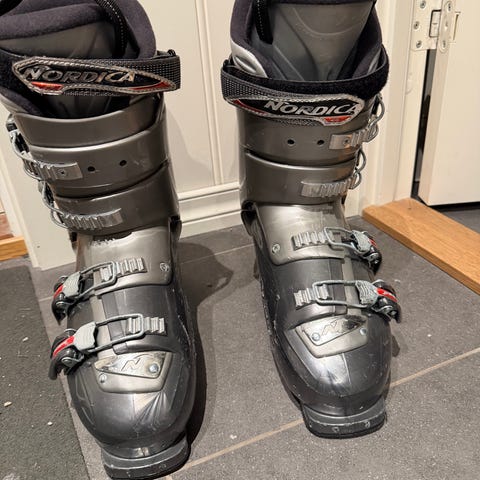 Salomon slalomstøvler i svart og sølvfarge. Modellen har fire justerbare spenner i metall foran for god tilpasning rundt fot og legg. Innerstøvelen er polstret for komfort og varme, og støvlene har hemper bak og foran for enklere av- og påtaking. Str 45. Passer til bred fot.