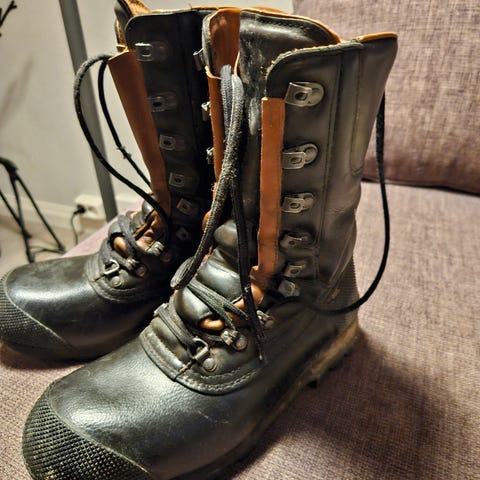En skikkelig solid fjellstøvel i slitesterkt skinn. Gir god beskyttelse for foten. Lekker design. Størrelse 41. Kjennes litt liten i størrelsen. Så og si ikke brukt. Vibram såle.