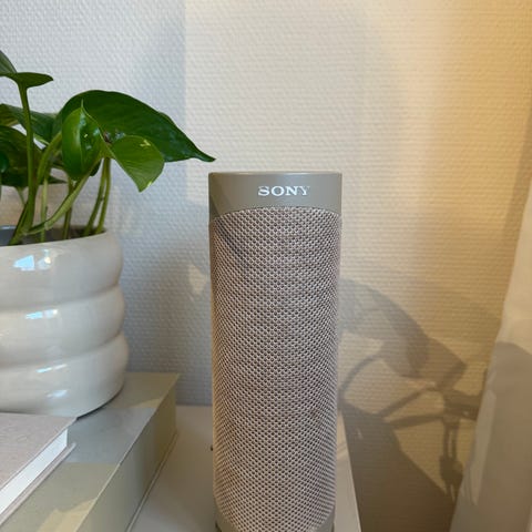 Sony SRS-XB23 bærbar høyttaler i svart. Trådløs Bluetooth-høyttaler i sylinderformet design med bærestropp. Støtter Extra Bass-funksjon og kan styres via Sony Music Center-app (tilgjengelig for iOS og Android). Høyttaleren er egnet for mobil og andre Bluetooth-enheter, og har konstruksjon tilpasset bruk både inne og ute. Leveres i original emballasje med produktinformasjon på esken.