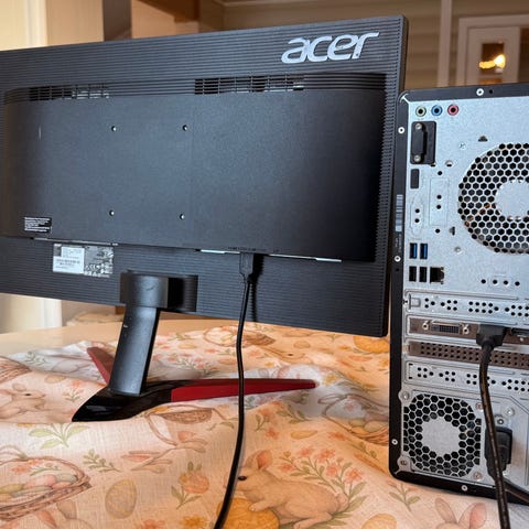 HP stasjonær PC i svart kabinett. Fronten har flere USB-porter, hodetelefonutgang og minnekortleser, mens baksiden har standard tilkoblinger for skjerm, lyd, nettverk og USB. Kabinettet er i tårnformat og egner seg for bruk på skrivebord eller gulv. Passer til generell kontorbruk, skolearbeid eller hjemmebruk, avhengig av innvendig maskinvarekonfigurasjon som prosessor, minne og lagring. Det er 2 bulker i i PC-en etter at den datt i gulvet men PC-en fungerer like fint