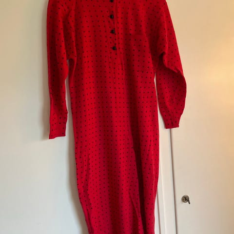 Hverdagskjole for dame i størrelse M. Kjolen er rød og laget i ull. Den har lange ermer og høy hals. Midjepartiet og skjørtet har ribbestrikkede, vertikale folder som gir struktur i stoffet. Lengden går omtrent til under kneet, avhengig av høyde på brukeren. Passer som hverdagskjole i kjøligere vær på grunn av ullmaterialet og den heldekkende fasongen.