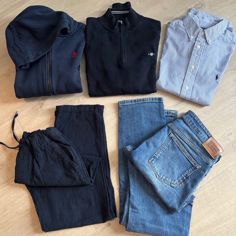 Gutte klespakke str 12-14 år (kan passe fra 11 år), det meste pent brukt og noe nesten ikke brukt. Diverse merke klær som Lee, Gant, Hilfiger, Polo ass. Og noe fra cubus og Kappahl.