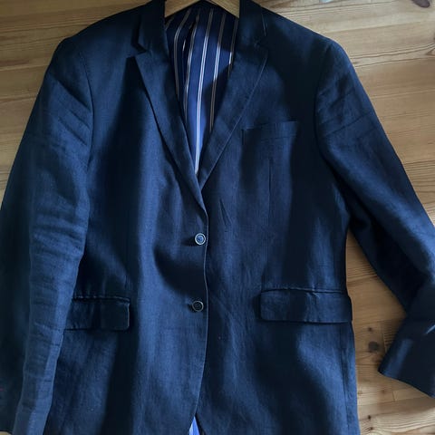 Tror det er en ull/lin miks, veldig behagelig og fin sommerblazer i en nydelig blåfarge.