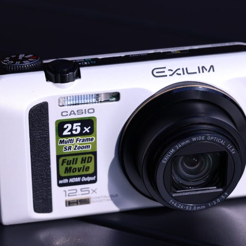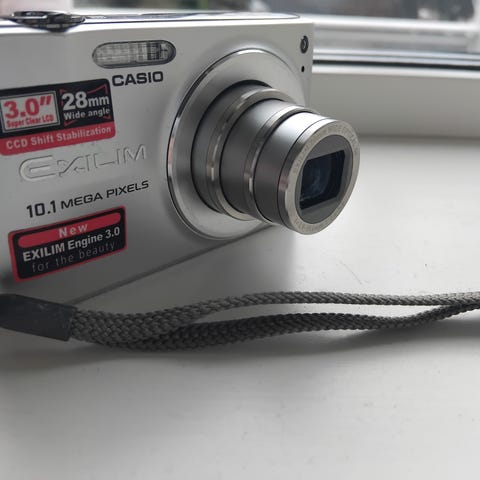 Casio digitalkamera i svart farge. Kompakt modell egnet til generell fotografering. Kameraet har innebygd blits og objektiv som trekkes inn i kamerahuset når det er avslått. Leveres med håndreim for tryggere grep ved bruk.