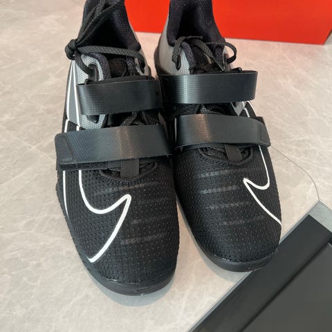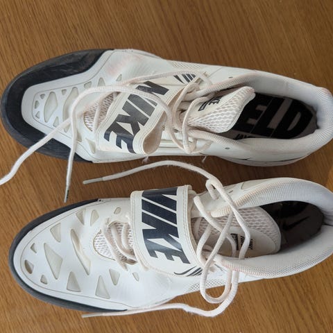Nike kast- sko i størrelse 45. Skoene er i svart og hvit med grønn innersåle og kraftig borrelåsstropp over vristen med Nike-logo. Overdelen har perforert design for ventilasjon, og yttersålen er i gummi. Modellen er godt egnet til trening og konkurranse-kule/diskos/slegge.