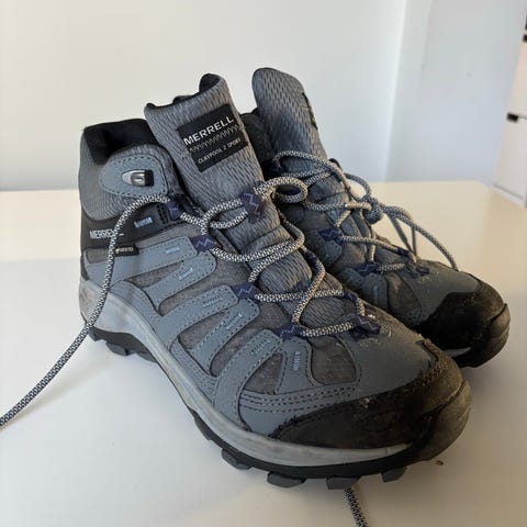 Columbia SM0155 tursko for herre i størrelse 43 (EU). Modellen er en mellomhøy tursko beregnet for fottur. Skoene har tekstil- og syntetisk overdel med forsterkninger i tå- og hælparti. Overdelen er merket «waterproof», noe som indikerer vanntett konstruksjon. Yttersåle i gummi gir grep på variert underlag, og mellomsålen er dempet for økt komfort ved gange. Snøring i front for justerbar passform. Fargekombinasjon i ulike gråtoner med enkelte kontrastdetaljer.