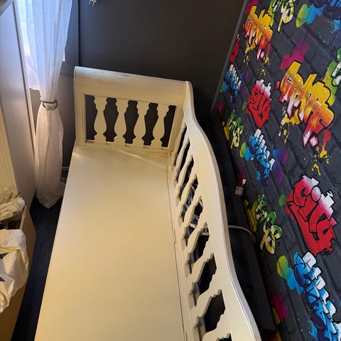 Bred enkelseng er helt ok, med madrass. 90x200 cm, rygg topp 100 cm over madrass. Fot fra golv opp til topp sengegavl ende er 90 cm.