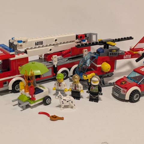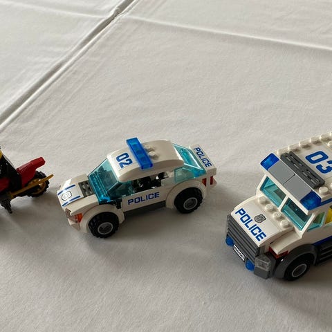 Biler, helikopter og kjøretøy fra sett 60141. Settet er egentlig en politistasjon, men den følger ikke med. Her får du tre instruksjoner med tilhørende kjøretøy og figurer. Virker som et eget sett slik det selges.