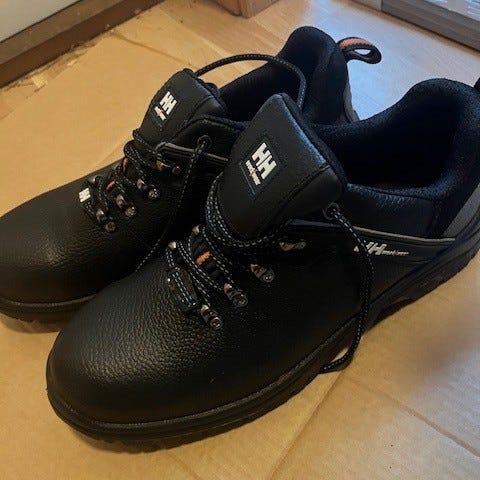 Helly Hansen vernesko størrelse 44. Skoene er i hovedsak svarte med lys mellomsåle og yttersåle med grovt mønster. Overdelen er i tekstil og syntetisk materiale, med forsterkninger i tå- og hælparti. Lukkes med BOA med stramming foran. Brukt maks 10 ganger. Må hentes