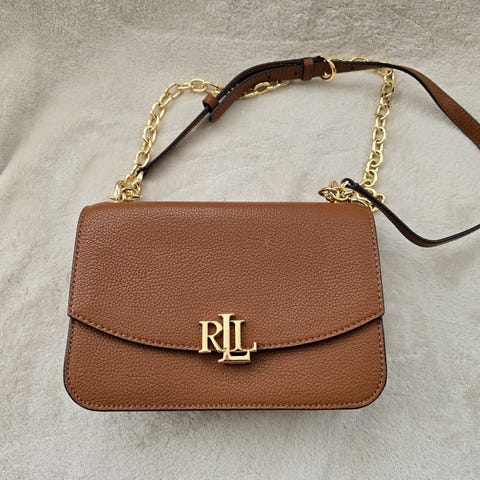 Ralph Lauren skulderveske i lær for dame. Vesken er laget i brunt skinn med struktur og har RL-logo i metall på fronten. Den har klaffelukking og skulderrem med kombinasjon av lenke og skinn. Innvendig er vesken inndelt i flere rom som gir plass til nødvendigheter som mobil, lommebok og nøkler. Egner seg godt til hverdagsbruk og enklere anledninger der man ønsker en kompakt og funksjonell veske. Støvposenfølger med i salget.