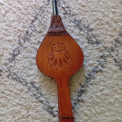 Selger fin og lite brukt peisblåser. Utskjæring med jeger/hund motiv og kobber tut. Belgen er ekte skinn og uten skader.