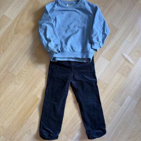 Nøstebarn ullsett for barn, unisex. Sett med genser og bukse i ull, størrelse 128. Farge blå. Genser med rund hals og lange ermer, bukse med strikk i livet og ved anklene. Passer som hverdagsplagg eller som lag under yttertøy i kjøligere vær.