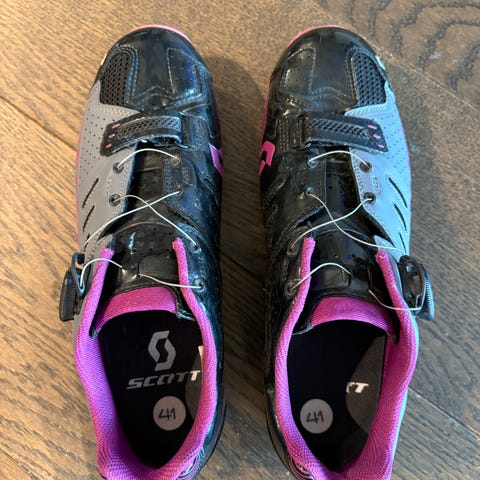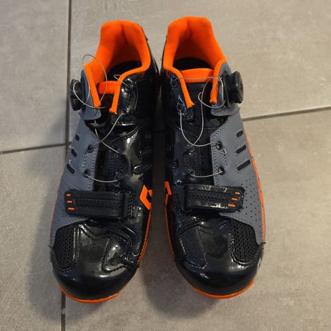 Fargekombinasjon svart, grå og rød. Egnet som sykkelsko til trening og tur, avhengig av kompatible pedaler og klosser.
