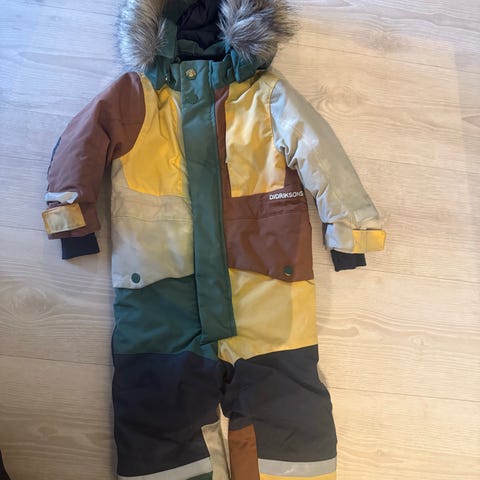 Didriksons vinterdress i størrelse 120 for unisex barn. Dressen er flerfarget med paneler i blant annet gult, turkis, rustrød og mørkeblå. Materialet er merket som 100% Waterproof.