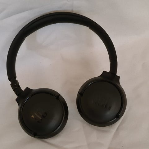 JBL trådløse on-ear hodetelefoner i svart. Modellen har polstrede øreputer og justerbar hodebøyle. På den ene ørekoppen finnes knapper for volum, avspilling og strøm, samt tilkoblingsport. Hodetelefonene er egnet til bruk med mobil, nettbrett og andre enheter som støtter trådløs lydtilkobling. Hodebøylen viser synlig slitasje i overflatematerialet, mens øreputene fremstår hele på bildene.