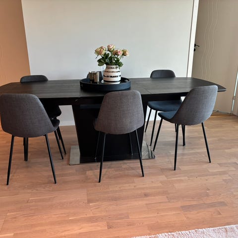 Bohus spisebord med ekstra bordplate og åtte svarte stoler