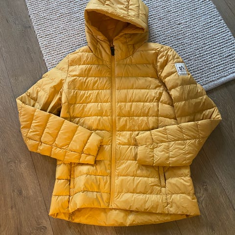 Twentyfour dun vinterjakke for dame i størrelse 36. Jakken er gul og har lett, vattert dunkonstruksjon med horisontale sømmer. Yttermateriale og fôr er i nylon, med fyll av hvit andedun og fjær. Jakken har hette, gjennomgående glidelås foran og lange ermer.