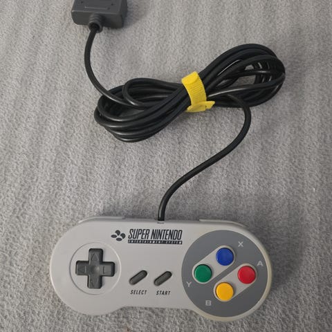 Nintendo Super Nintendo Entertainment System håndkontroll i grå plast med fargede A/B/X/Y-knapper. Kontrolleren har retningskryss, Select- og Start-knapper samt to skulderknapper. Kablet tilkobling med original SNES-kontakt, beregnet for bruk med Super Nintendo Entertainment System-konsoll. Testet ok