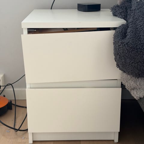 Selger to nattbord i hvit farge. De er i god stand med kun noen få bruksmerker.
