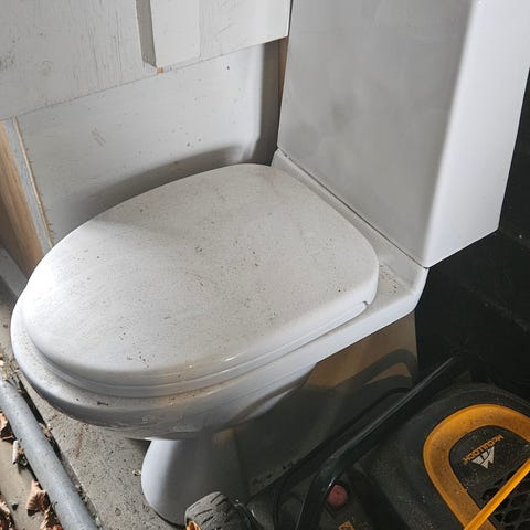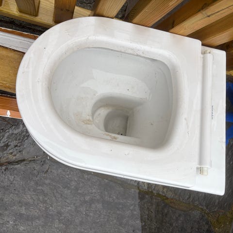 Gulvstående toalett i hvit porselen. Toalettet har integrert sisterne og avløp rett ned i gulv. Toalettet fungerer men trenger nytt lokk. Gis bort.