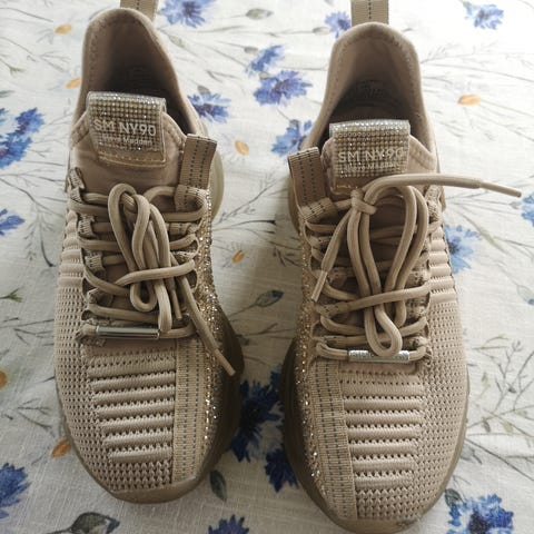 Steve Madden joggesko i størrelse 38. Skoene er i en beige farge med strikket overdel og snøring foran. Elastisk parti med Steve Madden-logo på siden. Lett og sporty modell som passer til hverdagsbruk og fritid.