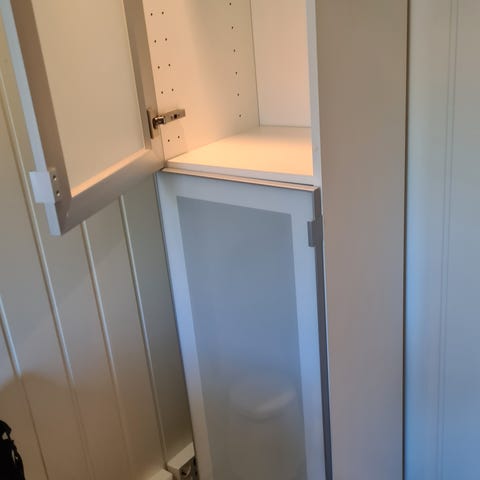 Overskap, som har vært brukt på vaskerom, til salgs. Består av et enkeltskap (bredde 30cm), to dobbeltskap (bredde 80cm) og et hjørneskap.