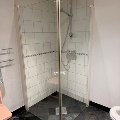 Dusjløsning med rette glassvegger og dusjhjørne i klart glass. Løsningen består av tre glassfelt med hengsler og beslag i metall. Passer for innbygging i hjørne på bad med sluk i gulv og dusjsone med glassavskjerming. Demontert og kan hentes i Oslo.