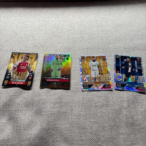 Topps Match Attax fotballkort lot med flere spesialkort. Bildene viser blant annet kort av Thiago Alcantara (Man of the Match Signature Style, Liverpool), Gianluigi Donnarumma (Limited Edition, PSG), Lucio (Vintage Vibes Legend, Bayer Leverkusen), Moisés Caicedo (Man of the Match, Chelsea) og Jules Koundé (Eliminator, Barcelona). Kortene har holografiske og spesialdesignede overflater med trykte spillerverdier.