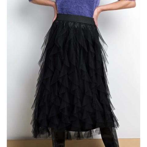 Svart tyllskjørt for dame i størrelse XS. Skjørtet er laget i tyll og har et lagdelt, strukturert uttrykk med flere lag stoff. Lengden er midi, omtrent til leggen, strikk i livet. Nypris kr 2.595.