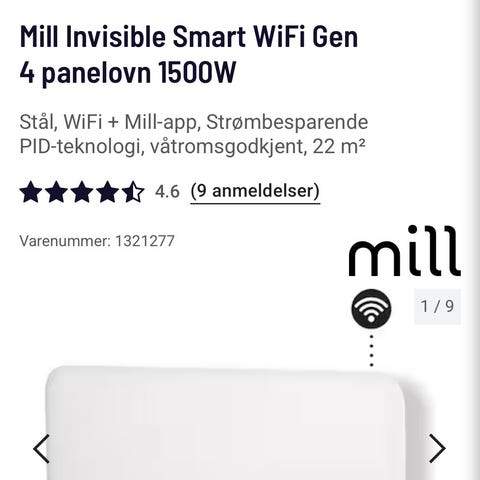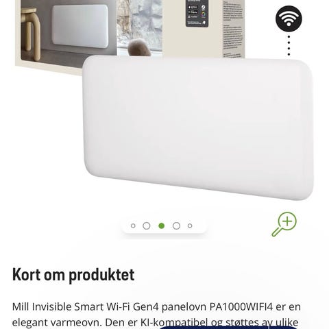 Mill panelovn med WiFi, effekt 2000W. Kjøpt ny i fjor. Vegghengt modell i hvit. Ovnen har elektronisk styring og kan kobles til Mill-appen via trådløst nettverk (2,4 GHz) for fjernstyring og temperaturkontroll. IPX4-klassifisering gjør den egnet for bruk i våtrom i henhold til gjeldende monteringsregler. Panelovnen er beregnet for fast tilkobling eller bruk med ledning og støpsel, avhengig av installasjon. Passer som hoved- eller tilleggsvarme i rom innenfor anbefalt kvadratmeterstørrelse fra produsent.