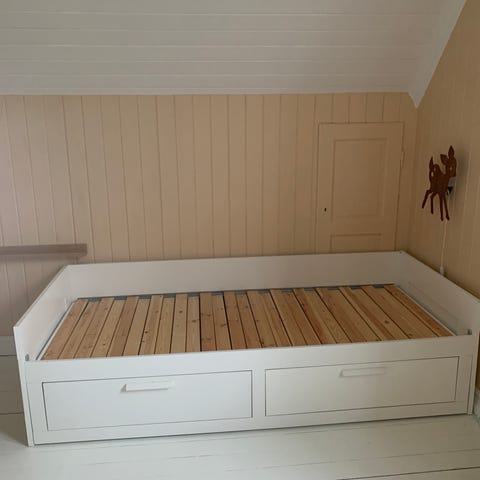 IKEA dagseng med skuffer i hvit farge. Sengen har to integrerte skuffer under liggeflaten som gir ekstra oppbevaringsplass til for eksempel sengetøy eller klær. Ribbebunn er inkludert i rammen. Passer som enkeltseng til daglig bruk og kan brukes som ekstra soveplass på gjesterom, barnerom eller i stue som kombinert sofa- og soveplass.