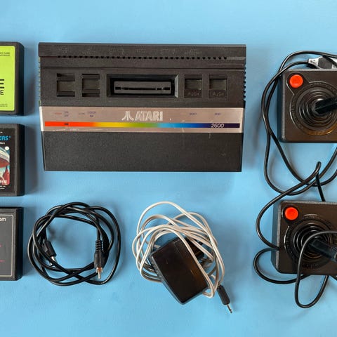 Fungerende Atari 2600 spillkonsoll med tilhørende kabler, to joystick‑håndkontrollere og flere spill i original eske.