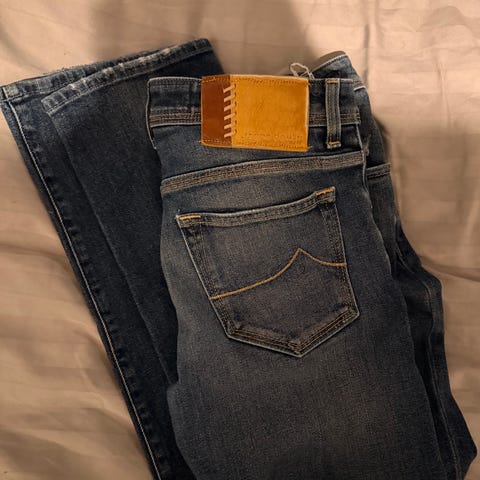 Jacob Cohën jeans for herre i blå denim. Buksen har livvidde W31 og er i størrelse M. Klassisk 5-lommers modell med knappgylf og kontrastsømmer. Produsert i denim-materiale, egnet til hverdagsbruk og fritid.