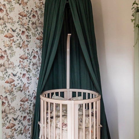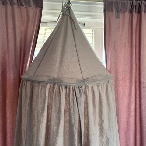 Sebra sengehimmel i rosa farge. Sengehimmelen henges i taket og danner et avskjermet område over barnesengen eller lekeplassen. Den har rund metallring øverst og stropper for feste av stoffet. Tekstilet faller ned rundt hele ringen og gir et teltlignende uttrykk. Passer til barnerom som dekor og avskjerming over seng eller kosekrok.