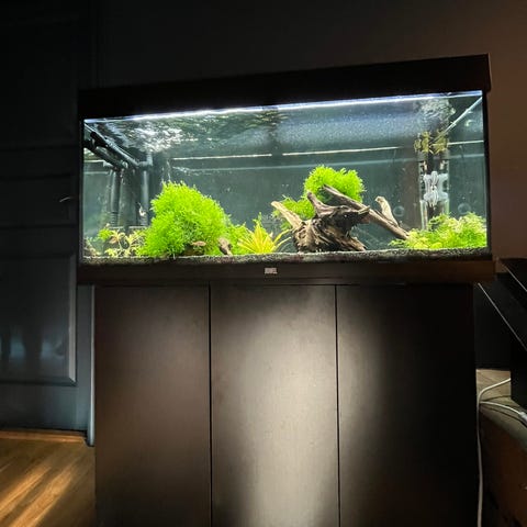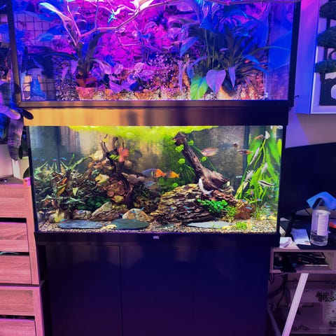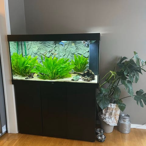 140 Liter åpen topp akvarium selges. Det er Eheim Pro 4+ ekstern filterløsning med inn- og utløpsrør, samt LED-belysning over karet. (Aquael Ultra Slim BT LED Light 60W ) Eheim varmekolbe.