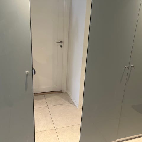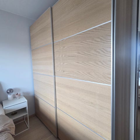 Ikea Pax garderobe skap med skyvedører, oppheng og hyller. Ene Siden og dørene er malt og kan fint males over i en annen farge om man vil det. På den ene siden, på siden av skapet, er det to hull som bare trenger å sparkles og males.