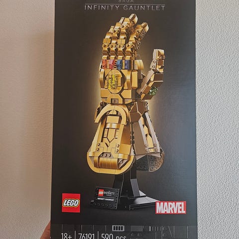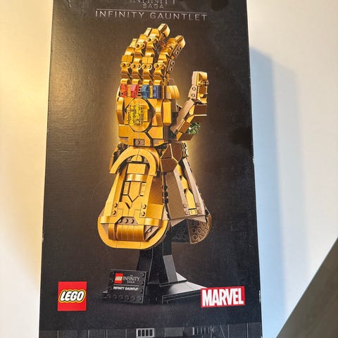 LEGO Marvel Infinity Gauntlet byggesett. Modellen forestiller Infinity-hansken fra Marvel-universet, bygget i gullfargede klosser med seks fargede «Infinity-steiner». Hansken står på en sort utstillingsstativ med navneplate. Egner seg som utstillingsmodell og samlerobjekt for Marvel- og LEGO-interesserte. Settet består av en detaljert, ikke-lekeskala modell beregnet for utstilling.