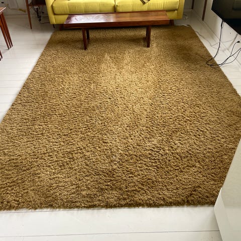 Ellos langhåret teppe i kremfarge. Teppe med tett og høy lugg som gir en myk og teksturert overflate. Undersiden har vevd bakside som gir stabilitet. Materiale er polyester. Målene er 200x300cm