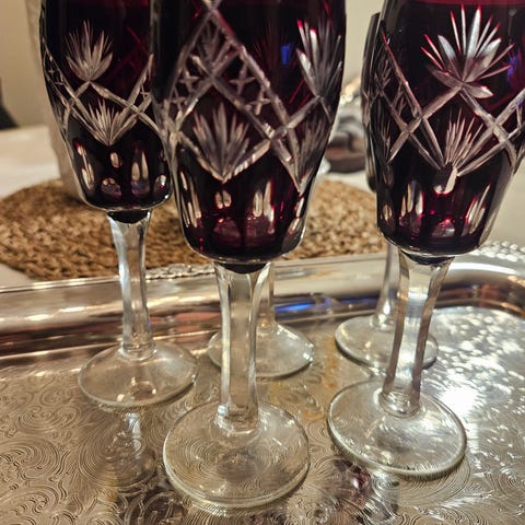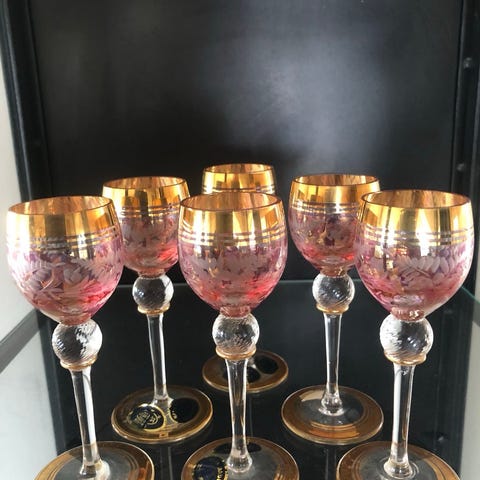 Selger et nydelig sett med røde champagneglass med detaljer i gull. Glassene har et eksklusivt og dekorativt design som virkelig skiller seg ut, perfekt til selskap, høytider eller som et blikkfang på bordet. 11 stk.