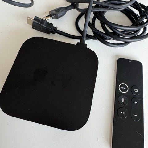 Apple TV med fjernkontroll i svart. Strømmespiller for tilkobling til TV via HDMI. Enheten har strømtilkobling, HDMI-utgang, optisk lydutgang og nettverksport (Ethernet). Fjernkontroll i aluminium med navigasjonsknapper og avspillingskontroller. Egnet for avspilling av digitalt innhold fra kompatible Apple-enheter og nettverkstjenester, avhengig av programvare og støttede funksjoner for den aktuelle modellen.