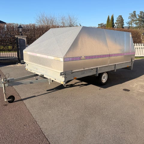 Tilhenger utstyrt som salgsvogn med åpne sider.