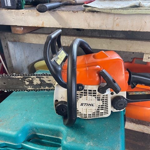 Den har nettopp fått ny pumpemembran. Det følger med et servicekit og to nye kjeder.