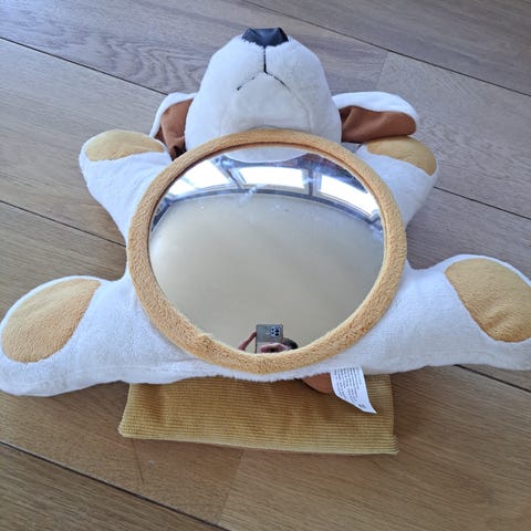 Speil til bilsete for baby i svart plast. Speilet festes med stropper og kan monteres på seteryggen slik at man kan se barnet som sitter bakovervendt i baksetet. Rektangulær form med avrundede kanter og justerbar vinkel via festeanordningen på baksiden.